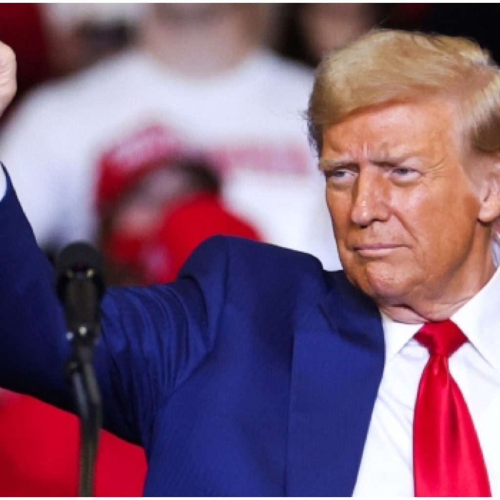 •Returning US President Donald Trump gestures at supporters today