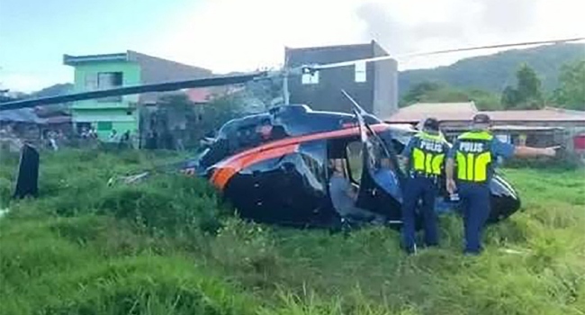 The helicopter was carrying five people, including two Malaysians, when it went down in a grassy area of a residential district in Pililla, a small town in Rizal province, at around 7:27 am (2327 GMT Tuesday), officials said.